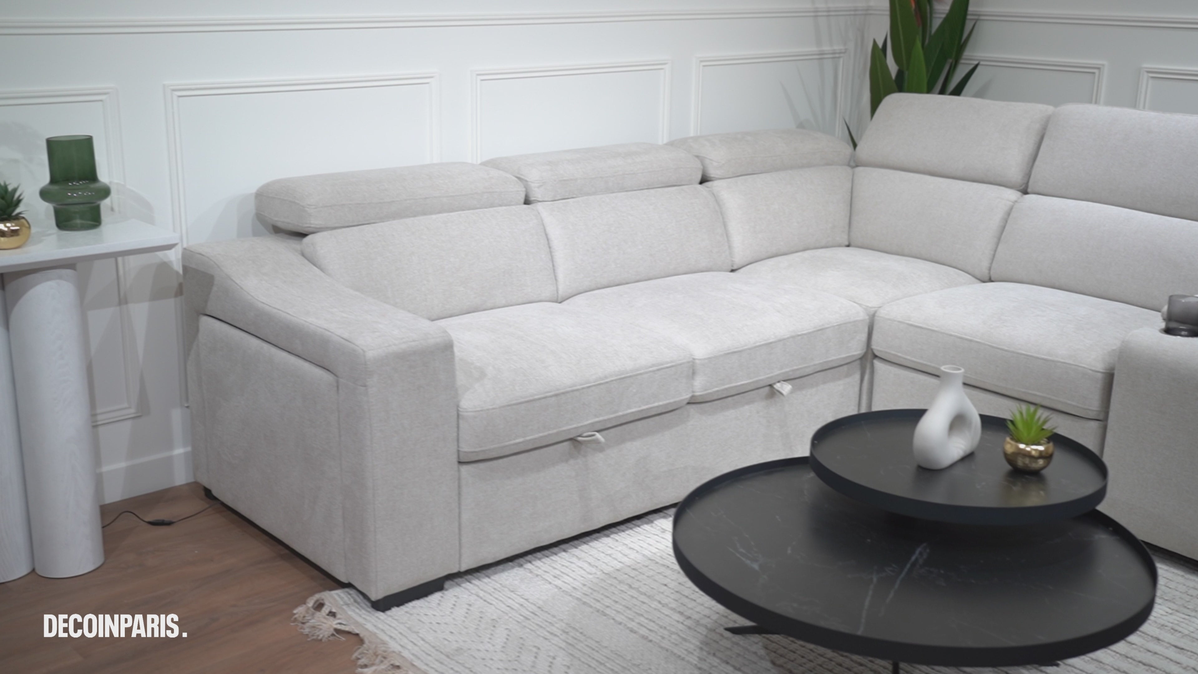Laissez-vous séduire par le grand canapé d’angle convertible avec coffre de rangement en tissu beige DEREK XL. Véritable compagnon de vos soirées et de vos moments en famille, ce grand canapé convertible d’angle droit sera idéal pour accueillir lors de vos séances télé, vos fêtes entre amis et même pour offrir l’hospitalité à vos invités pour la nuit.