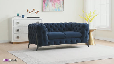 Le canapé 2 places capitonné chesterfield en velours bleu CARMEN apportera un superbe cachet à votre salon avec son allure cosy et élégante.