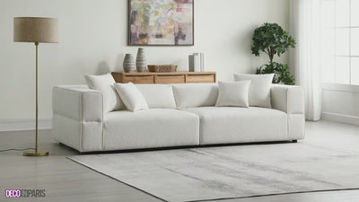 Une alliance entre confort et design, le canapé 4 places effet de mouton beige EVELYNE est parfait pour votre salon !
