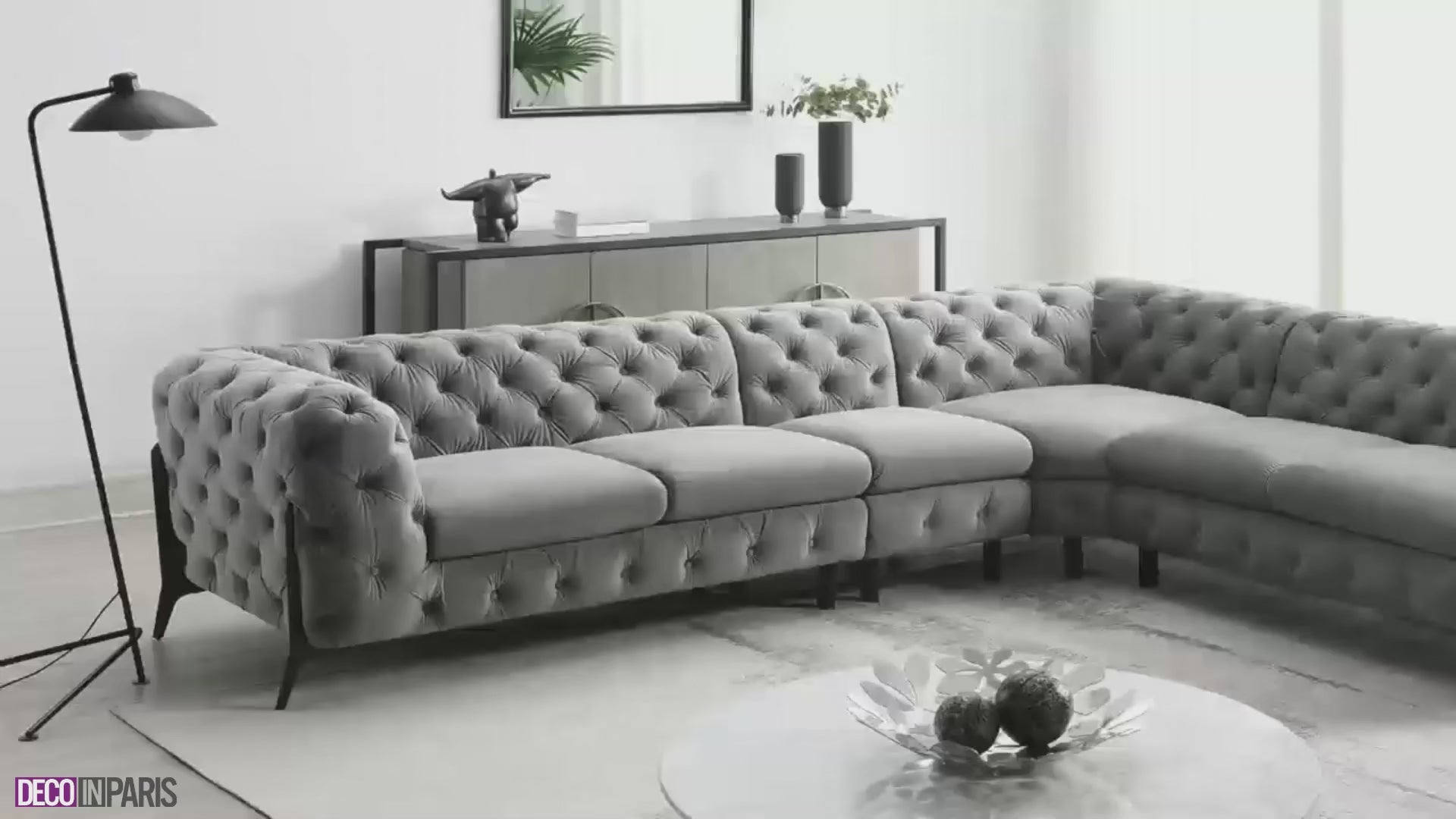 Découvrez notre canapé d'angle réversible en velours gris CARMEN et l’alliage parfait du style mythique et indémodable so british !
