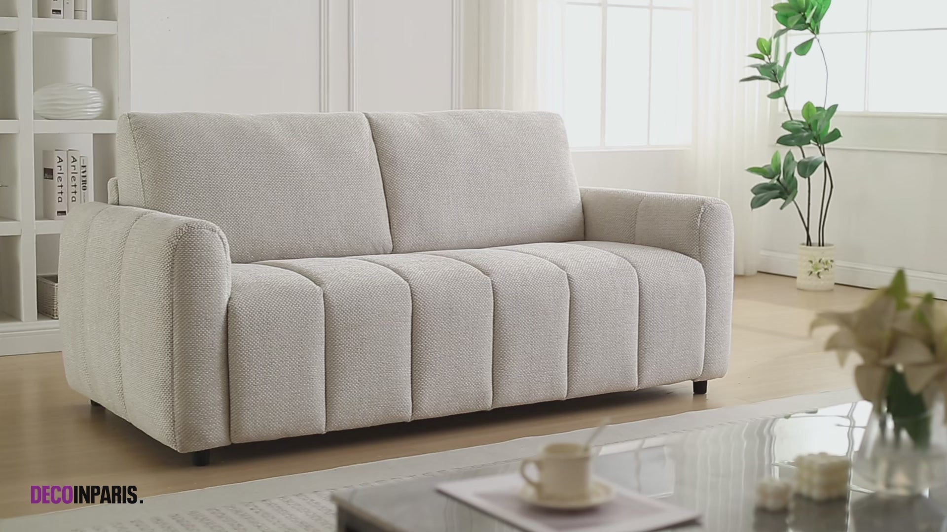 Avec son design structuré et sa silhouette chaleureuse, le canapé convertible ISANDRO est une véritable pièce maîtresse pour sublimer votre salon tout en offrant un couchage confortable. Son revêtement en tissu beige au toucher doux et ses détails de surpiqûres verticales lui donnent une allure à la fois moderne et accueillante.