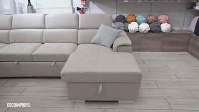 Découvrez notre somptueux canapé convertible et panoramique avec coffre de rangement en tissu beige OLIVER - Angles gauche !