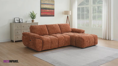 Le canapé d’angle relax électrique en velours chiné terracotta ALPES allie avec élégance confort et design contemporain. Grâce à son assise généreuse, ses formes arrondies et son revêtement en velours chiné texturé, il apporte une touche chaleureuse, moderne et raffinée à votre salon.