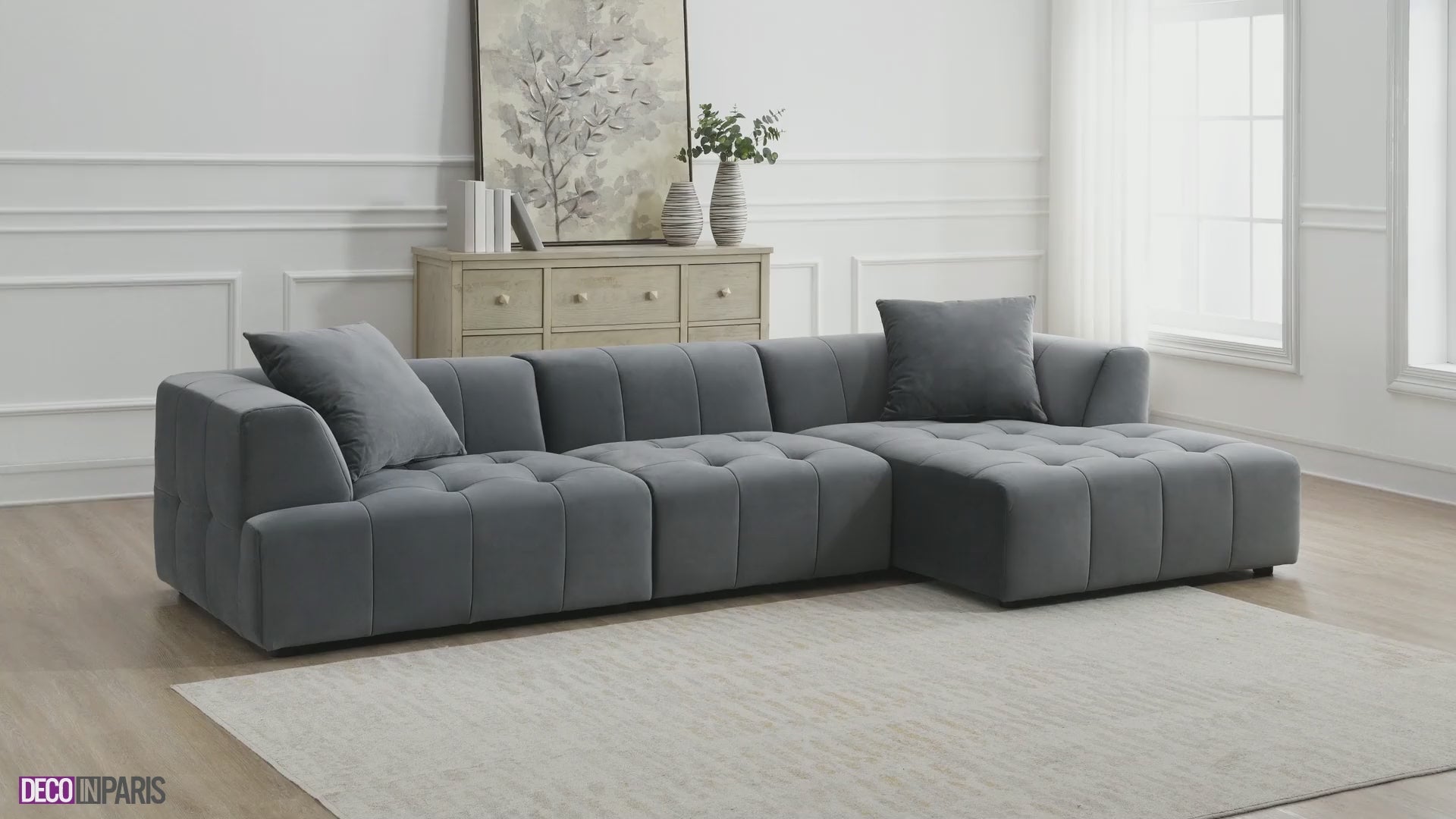 Pouvant accueillir jusqu’à 5 personnes, le canapé d’angle en velours gris KELIA sera un choix parfait pour tout ceux qui cherchent un meuble design, contemporain, confortable et élégant.
