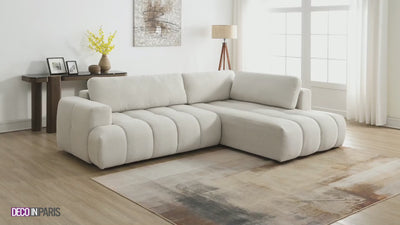 Le canapé d'angle convertible avec coffre de rangement en tissu beige HAVEN apportera une touche de confort et d’élégance à votre salon. Son design épuré et ses assises larges et moelleuses offrent une expérience de détente unique tout en sublimant votre intérieur.