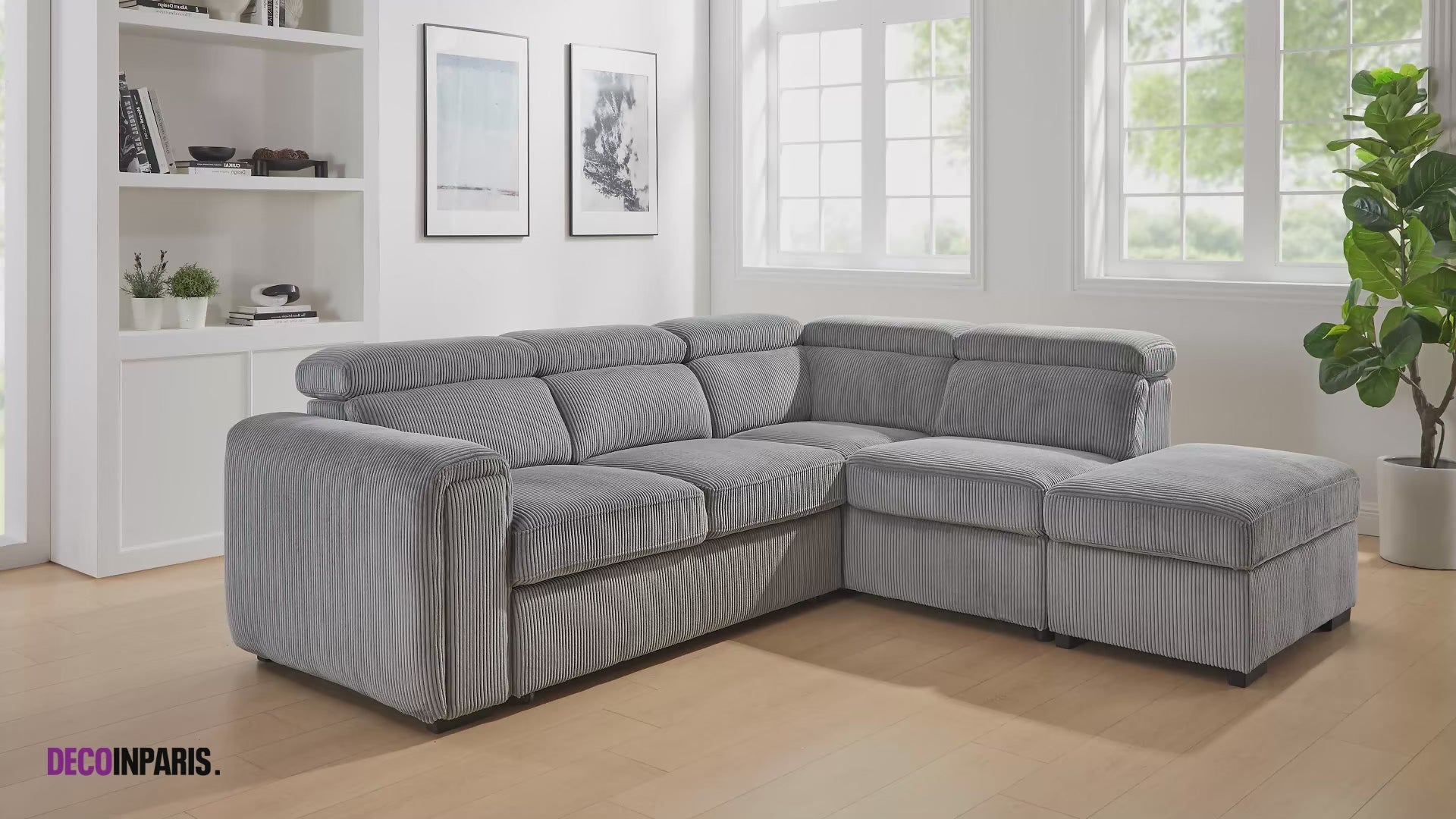 Offrez élégance et praticité à votre salon avec le canapé d'angle droit convertible 5 places en velours côtelé épais gris avec pouf coffre ZENOVA.