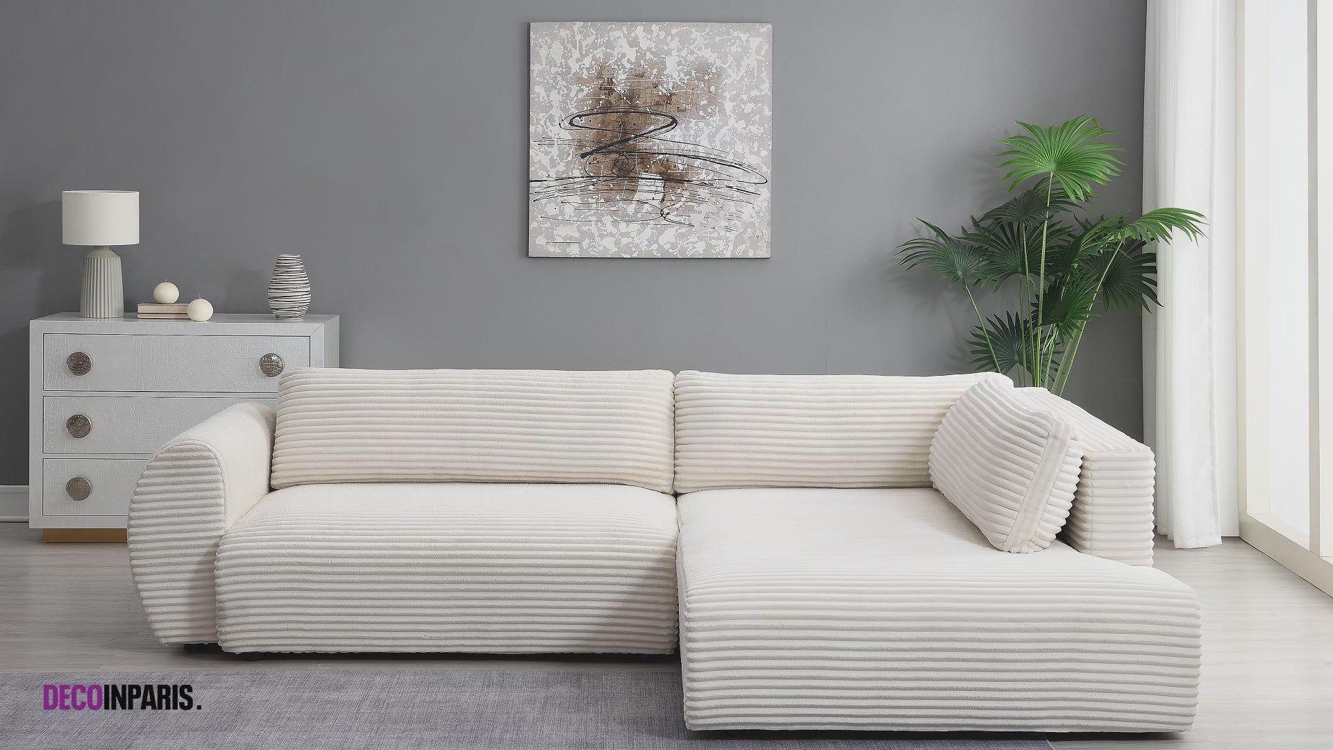 Le canapé d'angle convertible TILDA en velours côtelé beige est donc l'alliance parfaite de confort, élégance et praticité, transformant votre salon en un espace à la fois accueillant et sophistiqué.