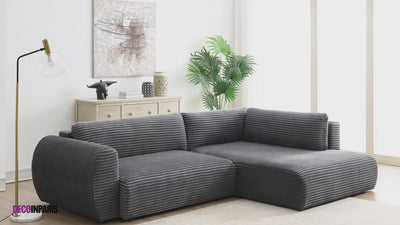 Vous souhaitez insuffler à votre intérieur une ambiance à la fois cosy et raffinée ? Laissez vous séduire par le canapé d'angle convertible avec méridienne en velours côtelé épais gris TILDA.