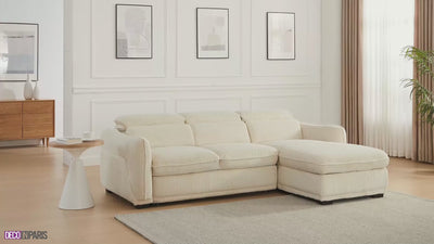 Craquez pour le canapé d'angle droit convertible en velours côtelé épais beige PETUNIA, une alliance parfaite entre élégance et praticité qui apportera du charme et du confort à votre salon.