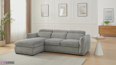 Craquez pour le canapé d'angle gauche convertible en velours côtelé épais gris PETUNIA, une alliance parfaite entre élégance et praticité qui apportera du charme et du confort à votre salon.
