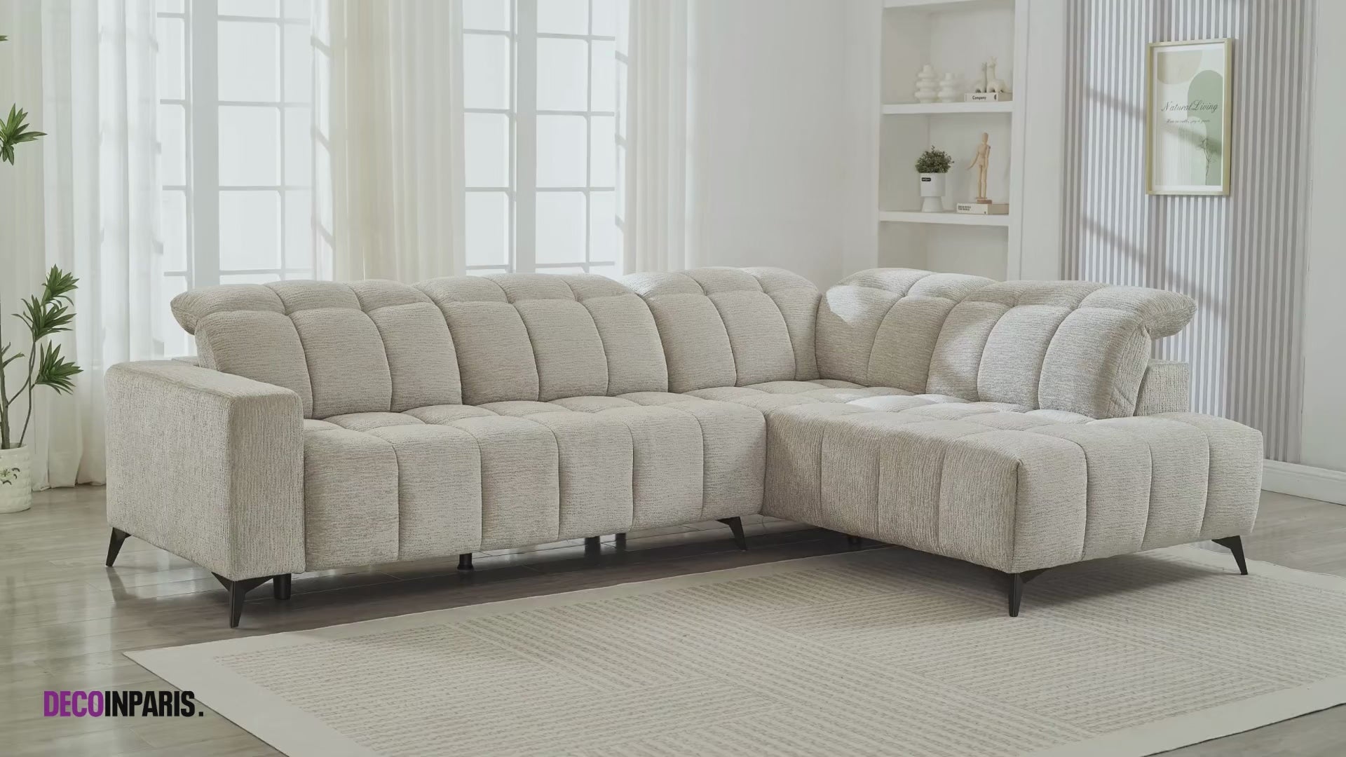 Pensé pour allier design contemporain et bien-être au quotidien, le canapé d’angle ALVAR en velours chiné beige transforme votre salon en véritable havre de confort.