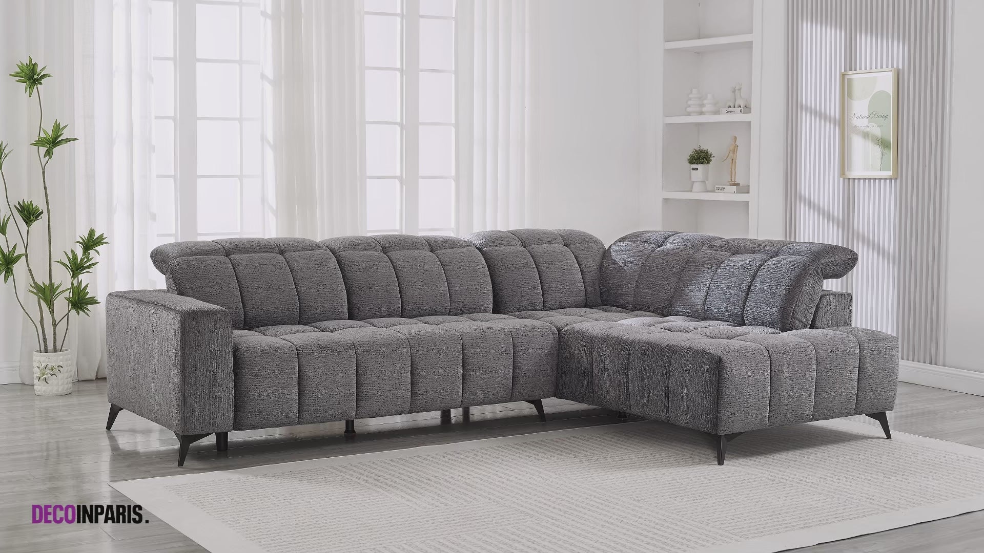 Pensé pour allier design contemporain et bien-être au quotidien, le canapé d’angle ALVAR en velours chiné gris transforme votre salon en véritable havre de confort.