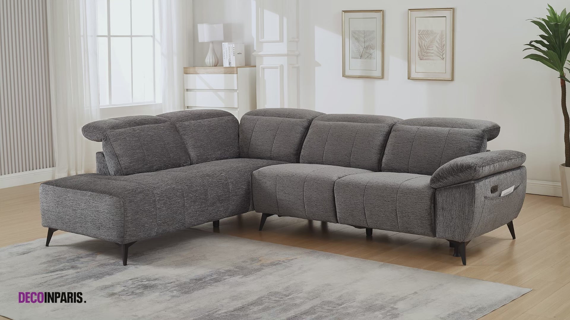 Avec son allure moderne et son confort haut de gamme, le canapé d’angle relax électrique SOLINA en velours chiné gris est une invitation à la détente. Parfait pour les salons spacieux, il allie esthétique raffinée et fonctionnalités bien pensées pour un usage quotidien.