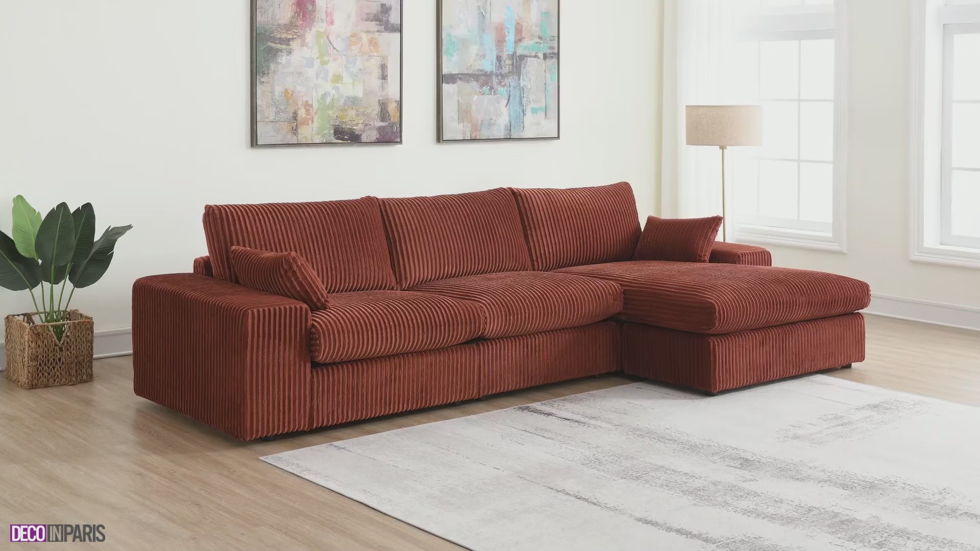 Découvrez le canapé d'angle réversible SIRINA en gros côtelé doux terracotta, idéal pour apporter une touche de modernité et d'élégance à votre salon. Son esthétique raffinée et son revêtement en velours côtelé s'intègrent harmonieusement à tous les styles d'intérieur, qu'ils soient design, classiques ou contemporains.