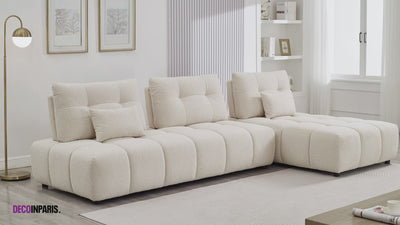 Le canapé d'angle réversible avec dossier ajustable en velours chiné beige ALANA allie style et confort absolu. Avec son design généreusement capitonné et ses dimensions spacieuses, il s’intègre parfaitement dans les salons modernes et raffinés.