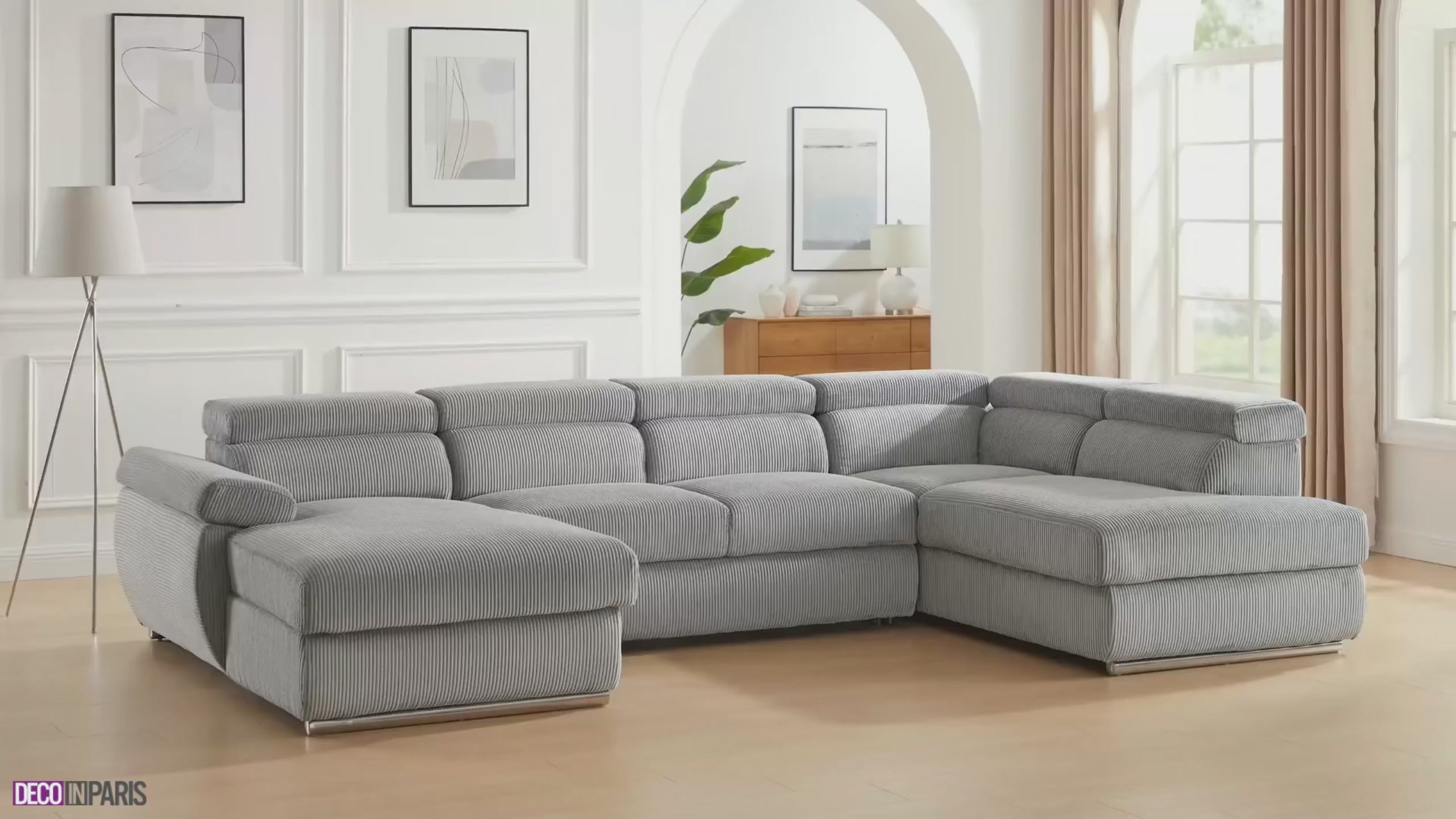Canapé panoramique convertible avec coffre en velours côtelé épais gris MARIANO- Angle gauche
