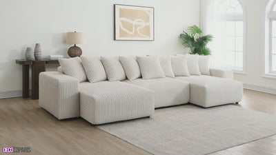Découvrez notre canapé panoramique convertible avec coffre de rangement en velours côtelé épais beige NOELIA.