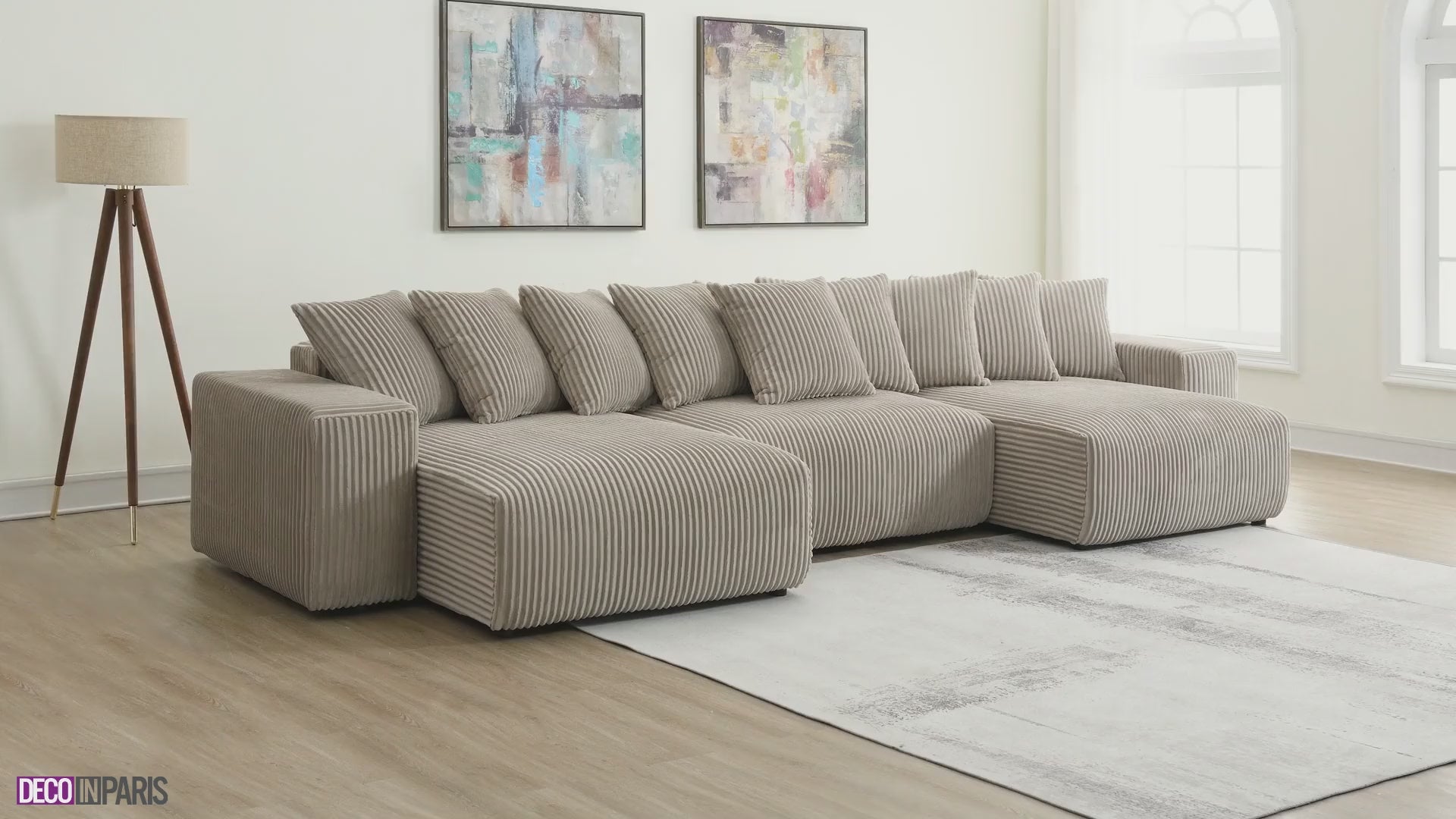 Découvrez notre canapé panoramique convertible avec coffre de rangement en velours côtelé épais taupe NOELIA.