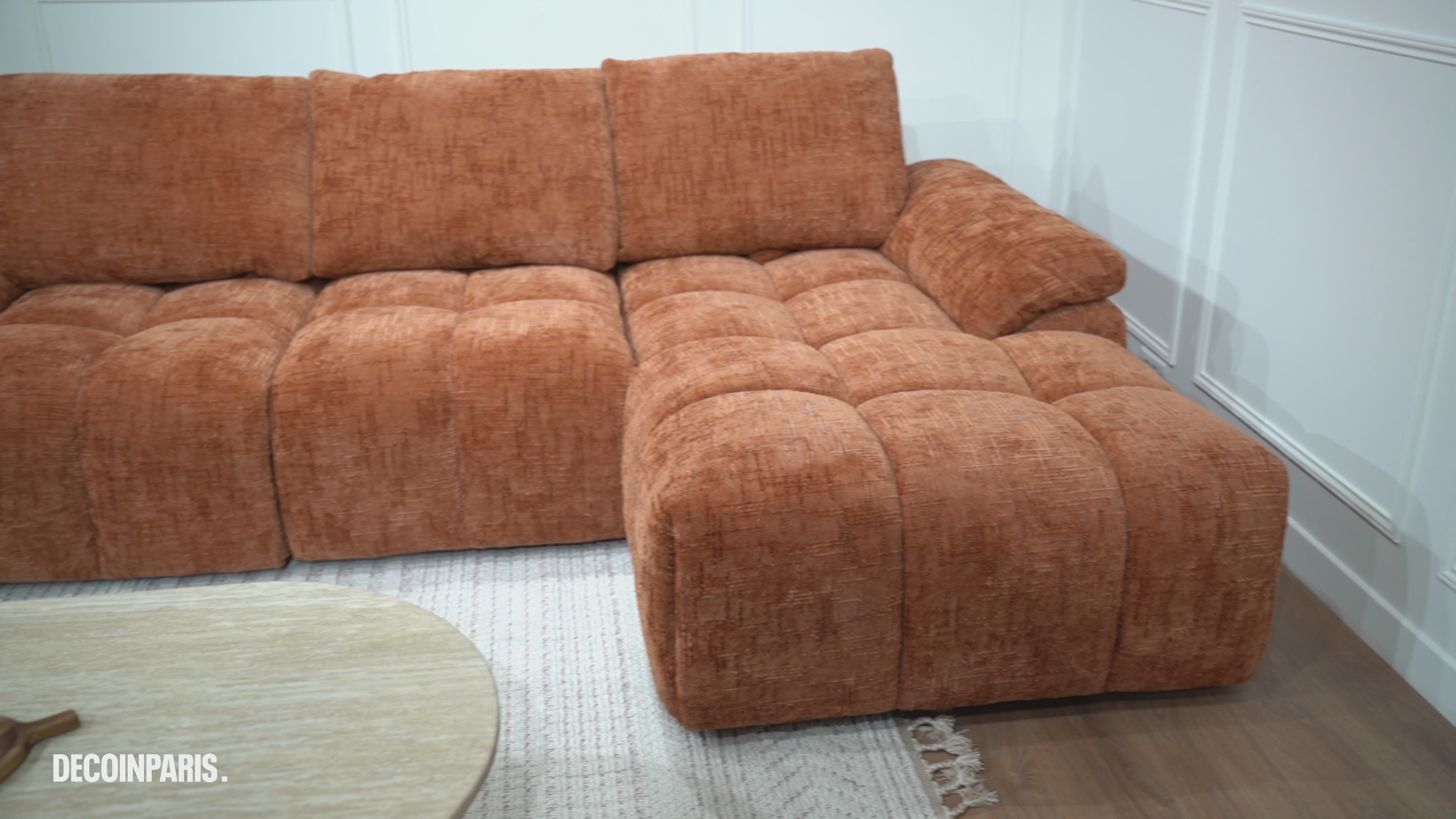 Il Divano angolare relax elettrico in velluto terracotta screziato ALPES combina elegantemente comfort e design contemporaneo. Grazie alla sua seduta generosa, alle sue forme arrotondate e al rivestimento in velluto testurizzato color erica, apporta un tocco caldo, moderno e raffinato al vostro salotto.
