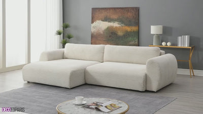 Rendi il tuo soggiorno uno spazio caldo e accogliente con il divano angolare trasformabile TILDA in velluto a coste spesso, la soluzione ideale per coniugare eleganza, comodità e praticità.