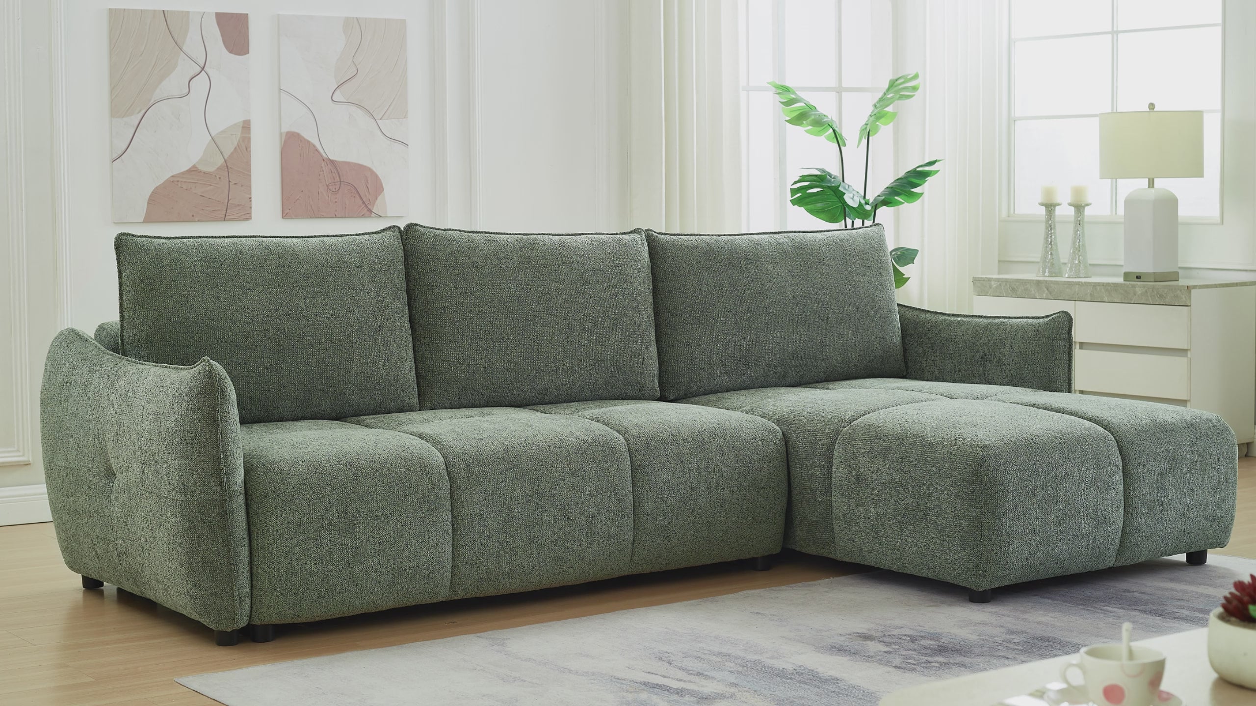 Divano angolare trasformabile e reversibile in velluto screziato verde oliva MYSA