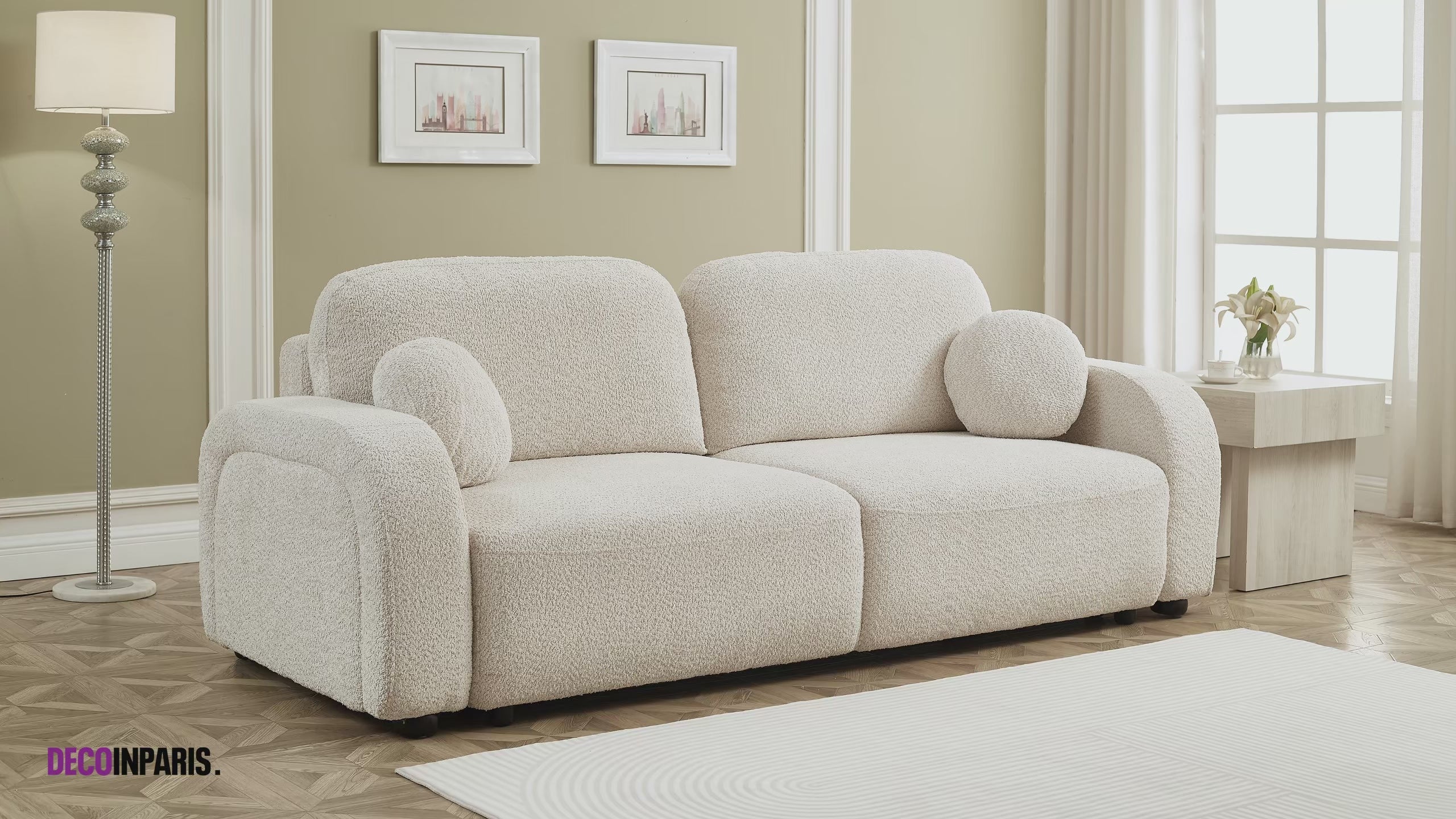 Il suo rivestimento in Tessuto spugna francese, morbido e caldo, crea un'atmosfera accogliente apportando un tocco di modernità. Il divano viene fornito con 2 piccoli cuscini coordinati, che completano il sedile e ne migliorano il comfort.