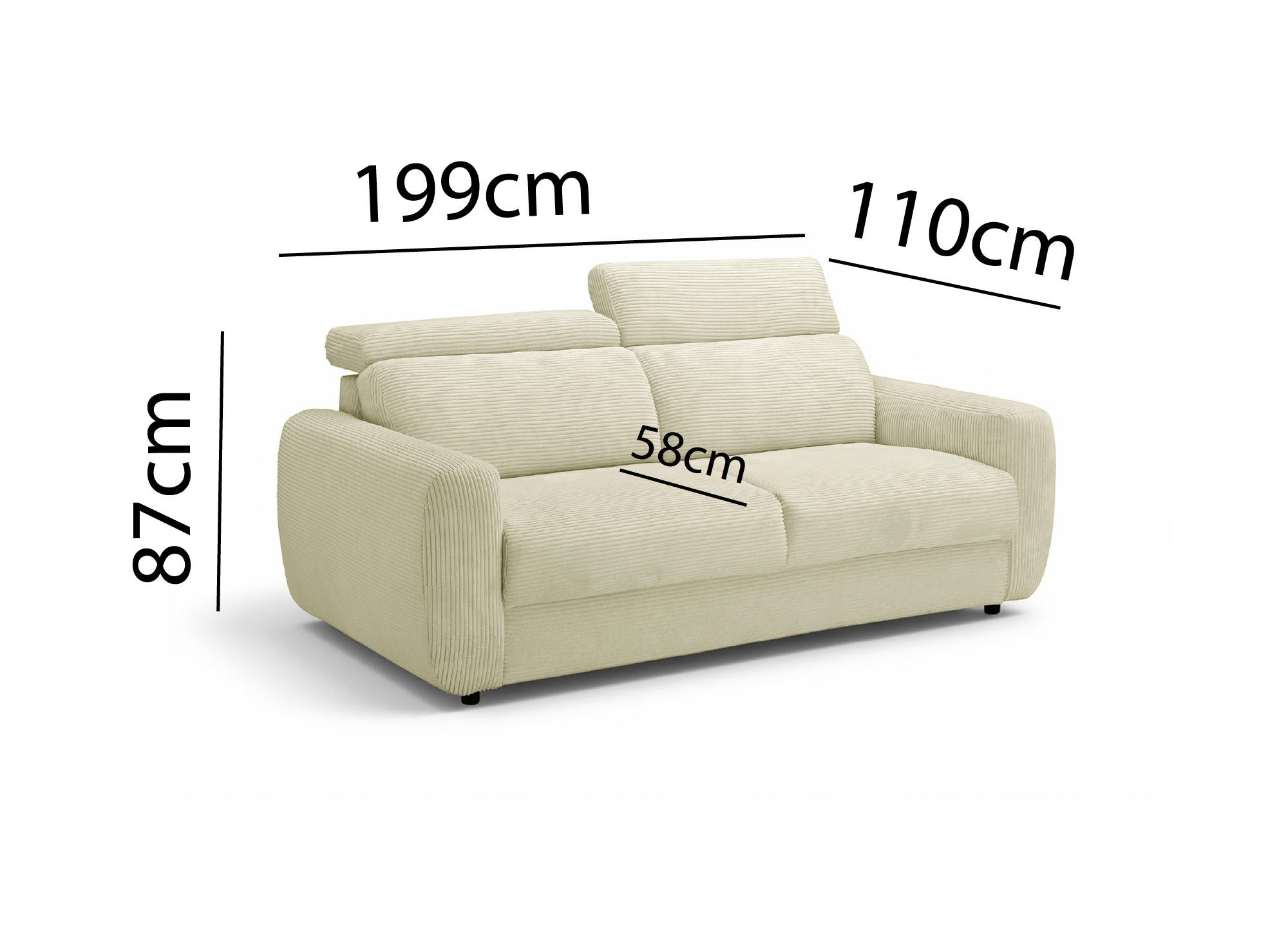 Il suo morbido e caldo rivestimento in velluto a coste beige regala una sensazione avvolgente e si integra perfettamente in un arredamento contemporaneo o più classico. I poggiatesta sollevabili forniscono un supporto ottimale per la testa e il collo durante la lettura, la visione della televisione o semplicemente per rilassarsi.