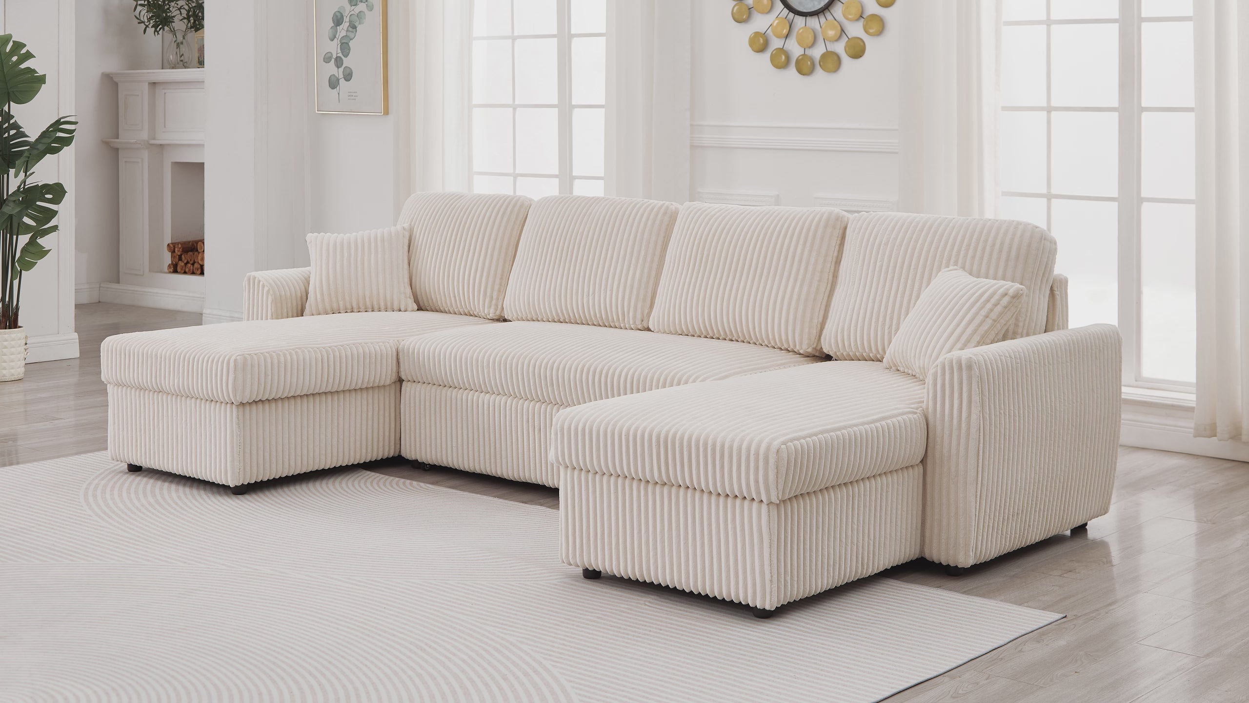 Divano convertibile panoramico ADRYEN in velluto a coste spesso beige con cassapanche