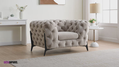 Le fauteuil chesterfield en velours beige CARMEN apportera un superbe cachet à votre salon avec son allure cosy et élégante. Il a tout d’un chesterfield traditionnel, revisité avec des accessoires modernes comme les pieds en métal noir qui emboitent le canapé.