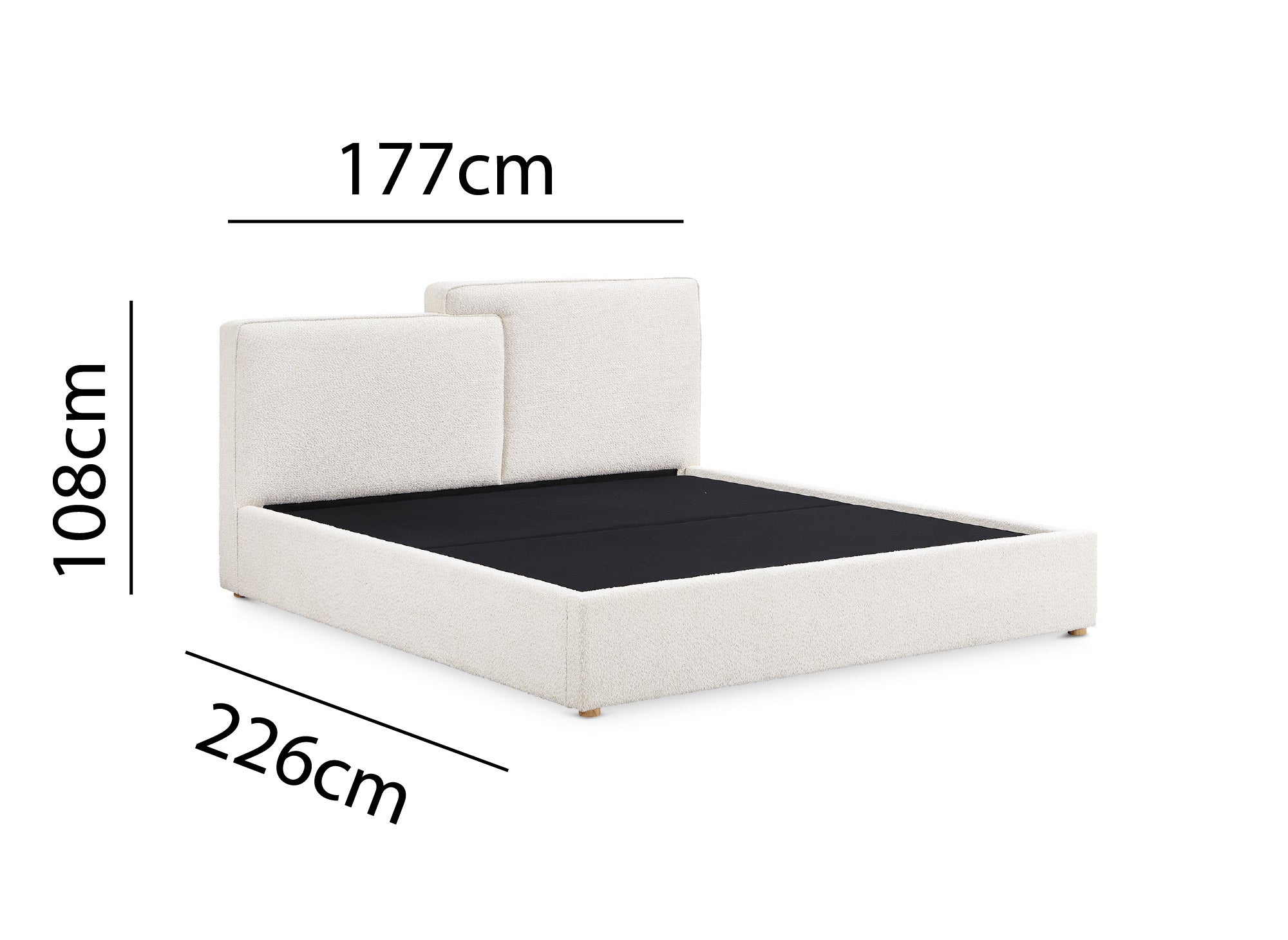 Revêtu d’un tissu bouclette doux et texturé dans une teinte beige, ce lit s’intègre harmonieusement à tout type de décoration intérieure.
