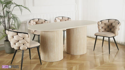 Accueillant jusqu'à 8 personnes, le design unique de la table DHARA est sublimé par ses pieds larges et ronds, conçus dans un style contemporain et épuré. Ces pieds robustes et harmonieux apportent à la fois stabilité et une touche artistique à l'ensemble, tout en renforçant l'esthétisme moderne de la pièce.