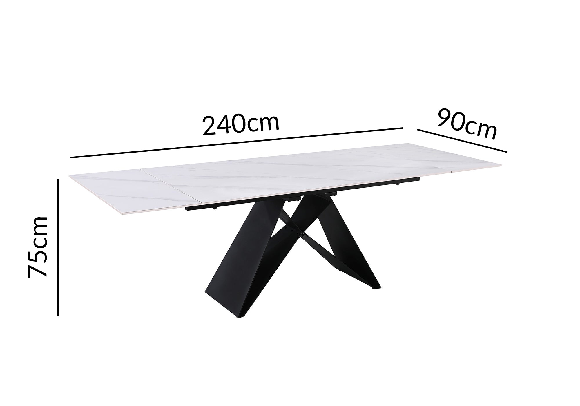 HELSINKI, il tavolo da pranzo allungabile che unisce design moderno e praticità. Il suo piano in ceramica bianca marmorizzata è abbinato ad una base in metallo nero.